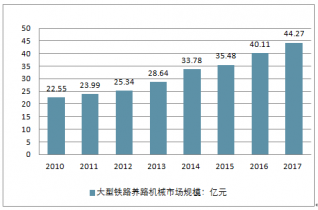 從銷售情況來看,“十一五”期間,我國大型鐵路養路機械保持快速增長,年均增長率達到20%以上,2010年以來,我國大型鐵路養路機械銷量仍然保持年均6%左右的增長,2016年全行業銷售大型鐵路養路機械共331臺,市場規模為40.11億元;若加上零部件和機械大修服務,整個大型鐵路養路機械市場規模達到55億元。