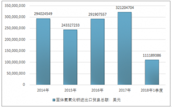 2016年我國固體氫氧化鈉進出口貿易總額291907557美元,2017年進出口貿易總額321204704美元;2019年1季度進出口貿易總額111189386美元。