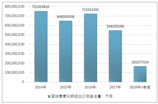 2016年我國固體氫氧化鈉進出口貿易總量721031491千克,2017年進出口貿易總量546205196千克;2019年1季度進出口貿易總量165377324千克。