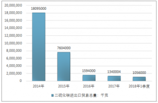 2016年我國二硫化碳進出口貿易總量1594000千克,2017年進出口貿易總量1340004千克;2019年1季度進出口貿易總量1056000千克。