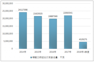 2016年我國(guó)磷酸三鈉進(jìn)出口貿(mào)易總量19887369千克,2017年進(jìn)出口貿(mào)易總量22063541千克;2019年1季度進(jìn)出口貿(mào)易總量4529275千克。