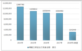 2016年我國(guó)磷酸三鈉進(jìn)出口貿(mào)易總額10356444美元,2017年進(jìn)出口貿(mào)易總額10264082美元;2019年1季度進(jìn)出口貿(mào)易總額3142449美元。