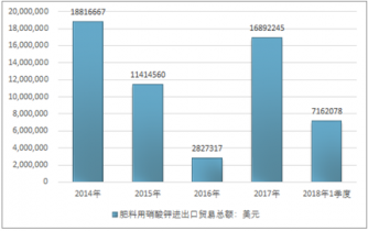 2014-2018年1季度肥料用硝酸鉀進(jìn)出口貿(mào)易總額走勢圖(單位:美元)