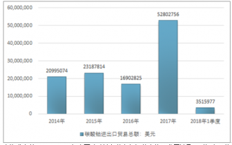 2016年我國碳酸鈷進出口貿易總額16902825美元,2017年進出口貿易總額52802756美元;2019年1季度進出口貿易總額3515977美元。