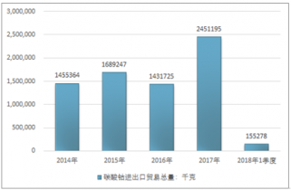 2016年我國碳酸鈷進出口貿易總量1431725千克,2017年進出口貿易總量2451195千克;2019年1季度進出口貿易總量155278千克。