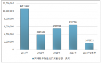 2016年我國丙烯酸甲酯進出口貿易總額5480006美元,2017年進出口貿易總額6487407美元;2019年1季度進出口貿易總額1672522美元。