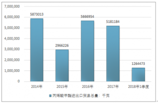 2016年我國丙烯酸甲酯進出口貿易總量5666954千克,2017年進出口貿易總量5181184千克;2019年1季度進出口貿易總量1264473千克。