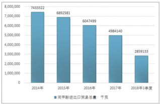 2016年我國間甲酚進出口貿易總量6047499千克,2017年進出口貿易總量4984140千克;2019年1季度進出口貿易總量2859133千克。
