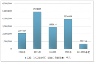 2016年我國乙酸(冰乙酸除外)進出口貿易總量2893614千克,2017年進出口貿易總量3954034千克;2019年1季度進出口貿易總量679255千克。