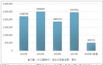 2014-2018年1季度乙酸(冰乙酸除外)進出口貿易總額走勢圖(單位:美元)