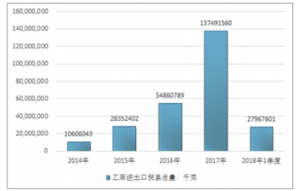 2016年我國乙苯進出口貿易總量54860789千克,2017年進出口貿易總量137491560千克;2019年1季度進出口貿易總量27967601千克。