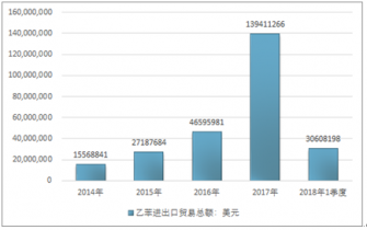 2014-2018年1季度乙苯進出口貿易總額走勢圖(單位:美元)