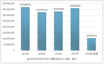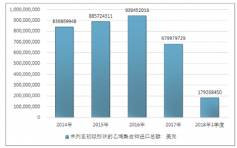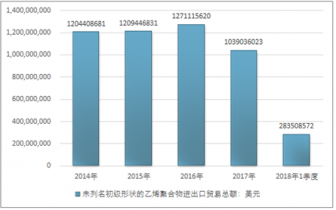 2016年我國未列名初級形狀的乙烯聚合物進出口貿易總額1271115620美元,2017年進出口貿易總額1039036023美元;2019年1季度進出口貿易總額283508572美元。
