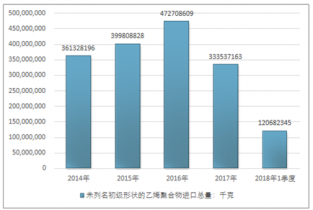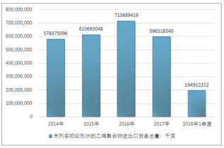 2016年我國未列名初級形狀的乙烯聚合物進出口貿易總量713689419千克,2017年進出口貿易總量596318340千克;2019年1季度進出口貿易總量194912212千克。