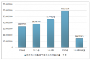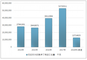 2016年我國初級形狀的聚異丁烯進出口貿易總量45774671千克,2017年進出口貿易總量59127118千克;2019年1季度進出口貿易總量14419985千克。