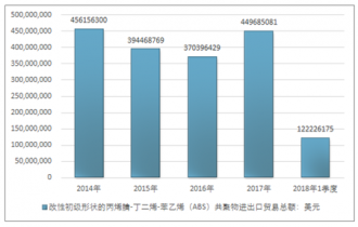 2016年我國改性初級形狀的丙烯腈-丁二烯-苯乙烯(ABS)共聚物進出口貿易總額370396429美元,2017年進出口貿易總額449685081美元;2019年1季度進出口貿易總額122226175美元。