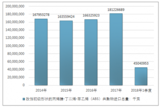 2016年我國改性初級形狀的丙烯腈-丁二烯-苯乙烯(ABS)共聚物進口總量166325923千克,2017年進口總量181226689千克;2019年1季度進口總量45040953千克。