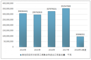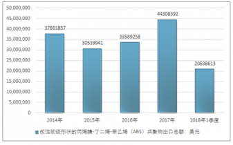 2016年我國改性初級形狀的丙烯腈-丁二烯-苯乙烯(ABS)共聚物出口總額33589258美元,2017年出口總額44308392美元;2019年1季度出口總額20838613美元。