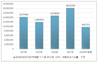 2016年我國改性初級形狀的丙烯腈-丁二烯-苯乙烯(ABS)共聚物出口總量14706026千克,2017年出口總量18133160千克;2019年1季度出口總量9637371千克。