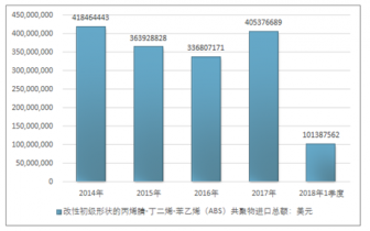 2016年我國改性初級形狀的丙烯腈-丁二烯-苯乙烯(ABS)共聚物進口總額336807171美元,2017年進口總額405376689美元;2019年1季度進口總額101387562美元。