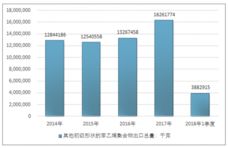 2016年我國其他初級形狀的苯乙烯聚合物出口總量13267458千克,2017年出口總量16261774千克;2019年1季度出口總量3882915千克。