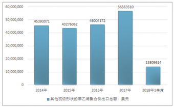 2016年我國其他初級形狀的苯乙烯聚合物出口總額46004172美元,2017年出口總額56563510美元;2019年1季度出口總額13809614美元。