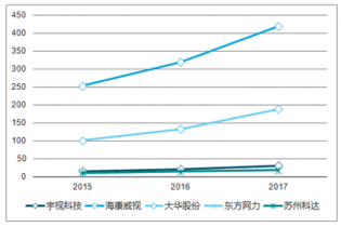 宇視科技、海康威視、大華股份、東方網(wǎng)力、蘇州科達(dá)2015-2017年?duì)I收對比(單位:億元)