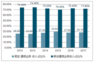 2012-2017年我國固定通信各移動通信業務收入占比情況