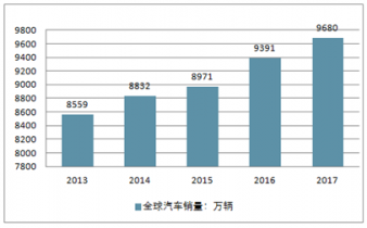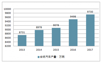 從全球汽車市場來看,2017年,全球汽車銷量9,680萬輛,同比增長3.14%。其中歐盟27國與歐洲自貿(mào)區(qū)銷量1,814.76萬輛,同比增長3.30%;北美自貿(mào)區(qū)銷量2,123.16萬輛,同比下降1.24%;中國銷量2,887.90萬輛,同比增長3.04%。從產(chǎn)量來看,2013-2017年全球汽車產(chǎn)量從8731萬輛增加到2017年的9730萬輛。增長近1000萬輛。而2013-2017年中國汽車產(chǎn)量增長超過500萬輛。中國汽車產(chǎn)量在全球產(chǎn)量中居首位。