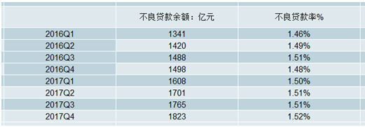 2016年第.一季度城商行不良貸款余額為1341億元,不良貸款率1.46%;到2017年第四季度,城商行不良貸款余額為1823億元,不良貸款率升至1.52%。