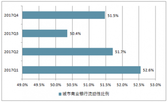 2017年四季度城商行流動性比例均保持在50%以上。2017年第四季度,城商行流動性比例為51.48%,較上一季度上升1.13個百分點。