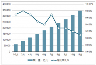20181-11月份當(dāng)月社會消費品零售總額累計同比增長走勢