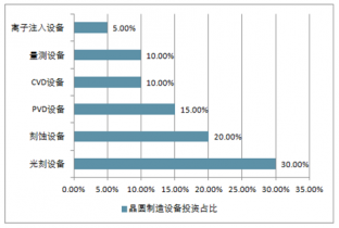 晶圓制造設(shè)備中,光刻機(jī)、刻蝕機(jī)和薄膜沉積設(shè)備為核心設(shè)備,分別占晶圓制造環(huán)節(jié)的約30%、25%和25%。