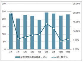 2019年11月份,金銀珠寶消費總額230億元,同比增長5.60%。2019年1-11月份金銀珠寶消費總額2494億元,同比增長8.10%。