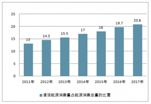 2011~2017年清潔能源消費(fèi)量占能源消費(fèi)總量的比重(單位:%)