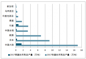 亞洲粉末冶金市場除日本外起步較晚,但自2000年后迅速崛起。2017年,亞洲鐵基粉末制品產(chǎn)量共計42.49萬噸,同比增長7.10%;銅基粉末制品產(chǎn)量為2.90萬噸,同比增長15.50%。其中,中國大陸鐵基粉制品、銅基粉制品產(chǎn)量均排名第.一,2017年鐵基粉末制品產(chǎn)量為16.96萬噸,占比約39.92%,銅基粉末制品產(chǎn)量為1.55萬噸,占比約53.35%。