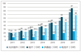 2017年我國多晶硅產量24.2萬噸,同比增長24.7%;硅片產量87GW,同比增長34.3%;電池片產量68GW,同比增長33.3%;組件產量76GW,同比增長31.7%。產業鏈各環節生產規模全球占比均超過50%,繼續保持全球首位。