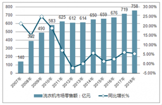 2007-2018年中國洗衣機(jī)市場零售額規(guī)模統(tǒng)計及增長情況預(yù)測