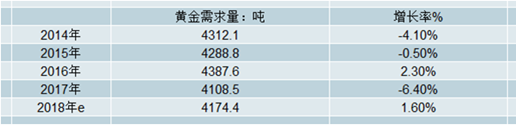 2014-2018年全球黃金需求及增速預測