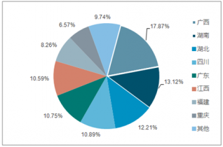 2017年我國柑桔生產主要集中在廣西、湖南、湖北、四川、廣東、江西、福建、重慶等地區,2017年該八大地區產量占比達到90.26%.