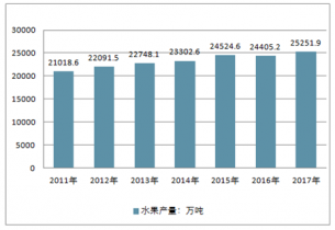 2017年我國(guó)水果總產(chǎn)量為25241.9萬噸,產(chǎn)量較2016年同期的24405.2萬噸增長(zhǎng)3.43%。