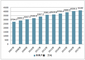 2017年我國(guó)蘋果總產(chǎn)量為4139.0萬噸,產(chǎn)量同比增長(zhǎng)2.47%。