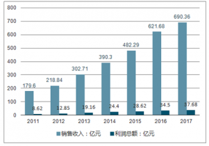 2011-2017年中國水產(chǎn)飼料所屬行業(yè)銷售收入及利潤情況