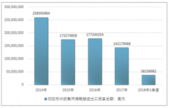 2016年我國(guó)初級(jí)形狀的聚丙烯酰胺進(jìn)出口貿(mào)易總額177244254美元,2017年進(jìn)出口貿(mào)易總額142179468美元;2018年1季度進(jìn)出口貿(mào)易總額36236982美元。
