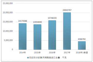 2016年我國(guó)初級(jí)形狀的聚丙烯酰胺進(jìn)口總量15748155千克,2017年進(jìn)口總量20043767千克;2018年1季度進(jìn)口總量4366782千克。