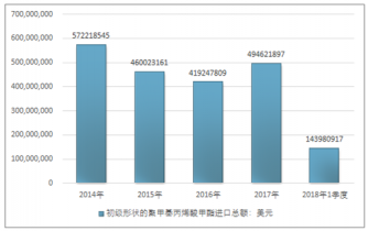 2016年我國初級形狀的聚甲基丙烯酸甲酯進口總額419247809美元,2017年進口總額494621897美元;2018年1季度進口總額143980917美元。