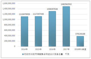 2016年我國(guó)初級(jí)形狀的丙烯酸聚合物進(jìn)出口貿(mào)易總量1306397638千克,2017年進(jìn)出口貿(mào)易總量1482562552千克;2018年1季度進(jìn)出口貿(mào)易總量379136168千克。