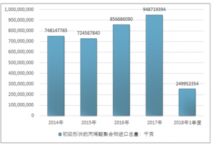 2016年我國(guó)初級(jí)形狀的丙烯酸聚合物進(jìn)口總量856686090千克,2017年進(jìn)口總量948719394千克;2018年1季度進(jìn)口總量249952354千克。