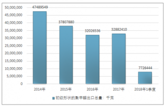 2016年我國(guó)初級(jí)形狀的聚甲醛出口總量32026536千克,2017年出口總量32882410千克;2018年1季度出口總量7726444千克。