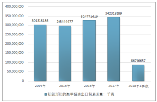 2016年我國初級(jí)形狀的聚甲醛進(jìn)出口貿(mào)易總量324771619千克,2017年進(jìn)出口貿(mào)易總量342318189千克;2018年1季度進(jìn)出口貿(mào)易總量86796657千克。